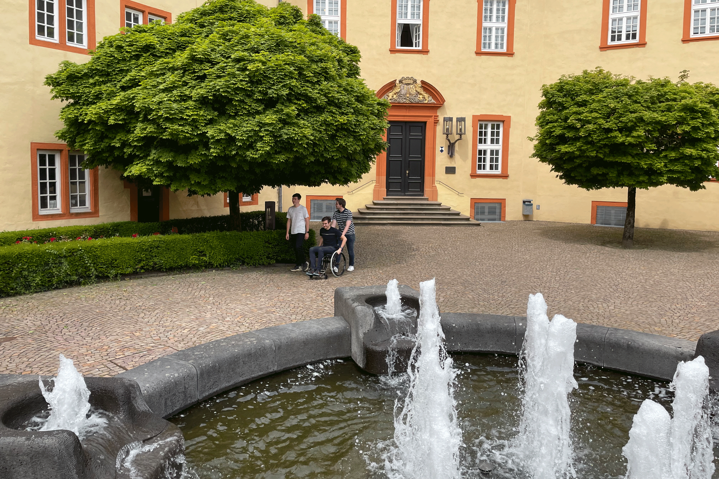 Nach der Begrüßung bekamen die Studierenden die Möglichkeit, die Perspektive von Menschen mit Behinderungen einzunehmen. Beispielsweise fuhren sie mit einem Rollstuhl durch das Schloss und setzten sich auf diese Weise aktiv mit den Herausforderungen und Bedürfnissen von Rollstuhlfahrerinnen und -fahrern auseinander. Die alltäglichen Schwierigkeiten von Menschen mit Mobilitätseinschränkungen wurden ihnen dabei plakativ vor Augen geführt.