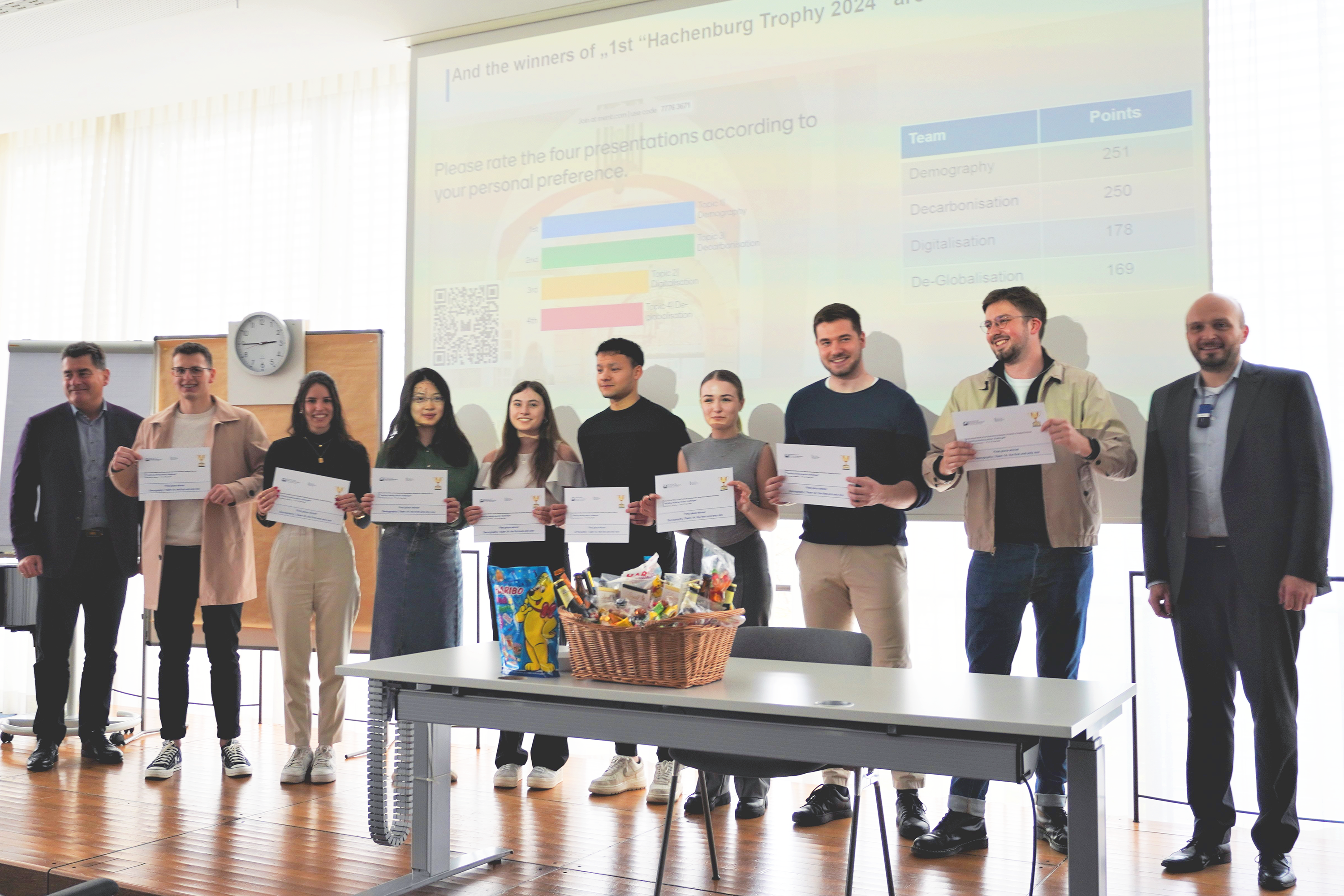 The theme of the International Week, which the Bundesbank’s University of Applied Sciences has been organising for years, was to address current challenges in the banking sector, with a particular focus on the four “Ds”, i.e. digitalisation, decarbonisation, de-globalisation and demographic developments. In April, 22 students from the People’s Bank of China School of Finance of Tsinghua University in Beijing, China, 13 students from the University of Toulon (France), as well as 11 students each from the SGH Warsaw School of Economics in Warsaw (Poland) and the University of Economics in Bratislava (Slovakia) spent one week in Hachenburg. Together with more than 60 Hachenburg students, a large number of international working groups were formed, each of which dealt with the impact of one of the four “Ds” on the banking sector. Each team represented a medium-sized, internationally active credit institution and was tasked with developing longer-term business strategies as concrete solutions to the challenge it had been assigned to. The aim of the exercise was to raise awareness of the different perspectives and experiences of participants from different countries and to bring them together. The results were then shared in short presentations of around 15 minutes. A jury consisting of the heads of the delegations and full-time lecturers from the Bundesbank’s University of Applied Sciences assessed all results and selected the four best teams. These teams went on to present again their results to all participants, who were then invited to vote on the winning team. The “Hachenburg Trophy 2024” was a large chocolate prize, ideal for all to share. In addition to expanding their own knowledge, working in groups and presenting the results together helps students not only exchange ideas in the common working language, English, but also allows them to get to know each other better on a personal level. In this way, they learn a lot about the different approaches in the respective countries and their culture, said Rector Erich Keller, who initiated the very first International Week back in 2012.